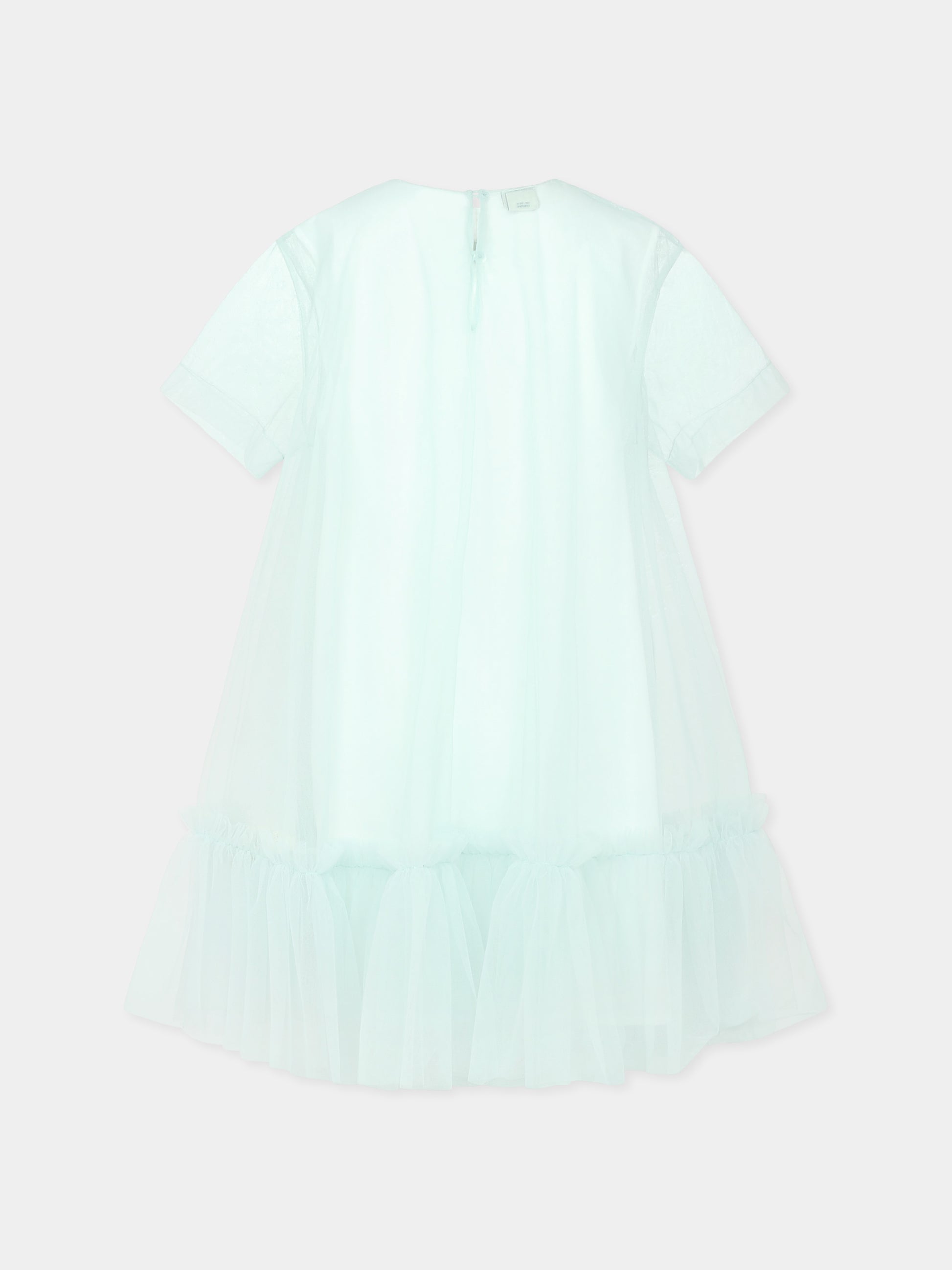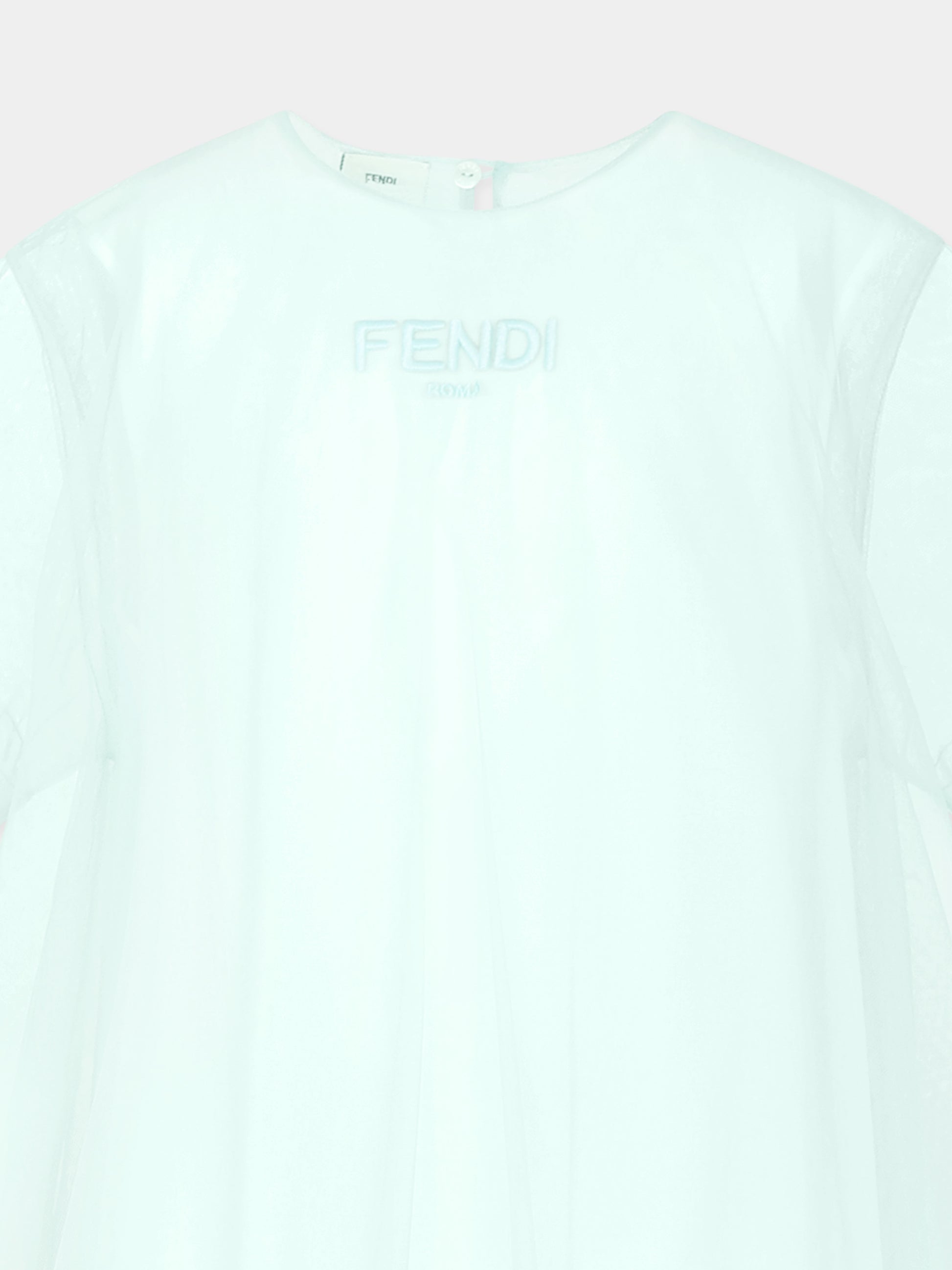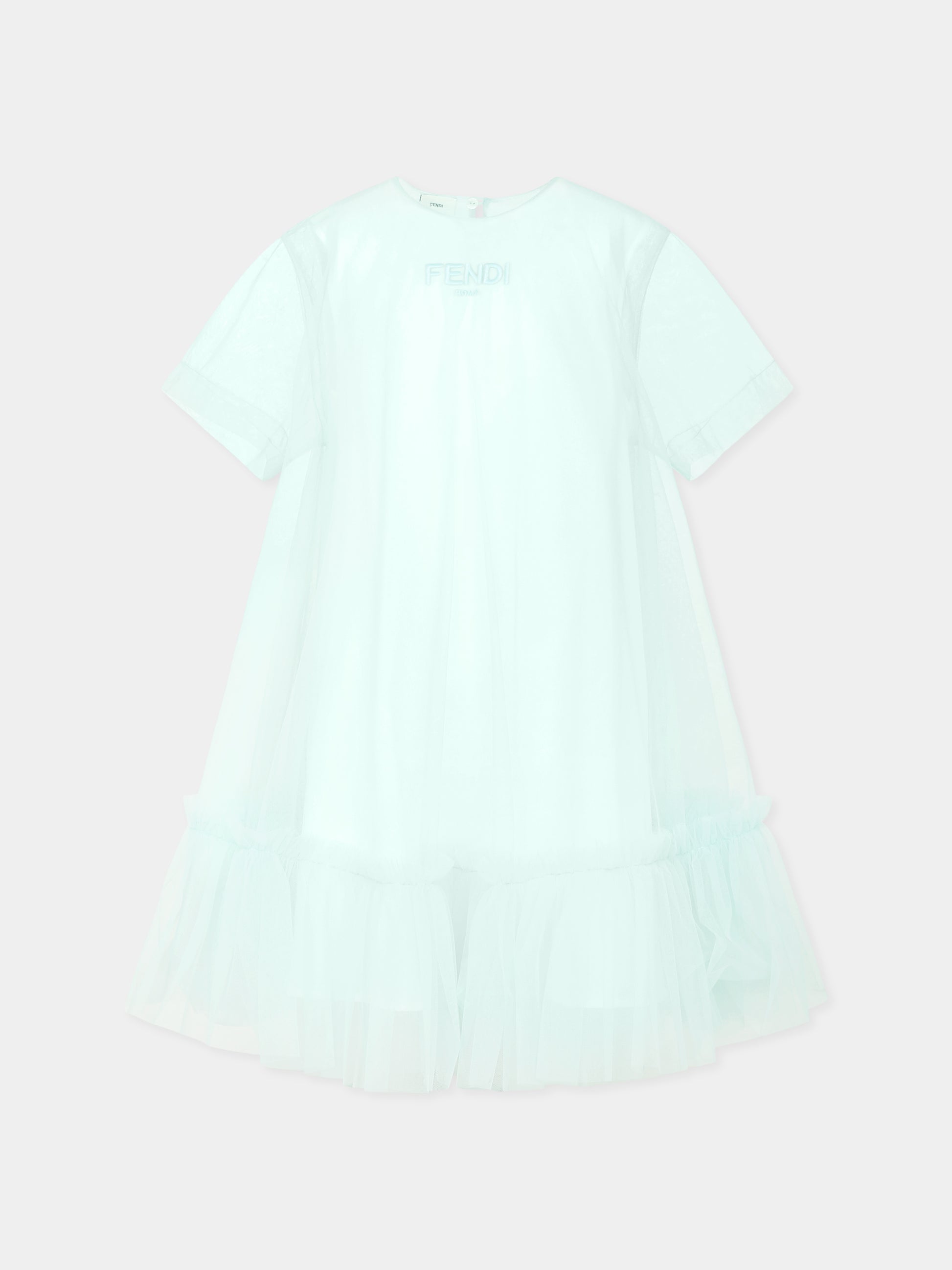 Colore: Verde Descrizione: Vestito verde del luxury brand Fendi Kids, realizzato in tulle dall'effetto sovrapposto. Presenta maniche corte, girocollo, orlo arricciato e mussolina di cotone. Si chiude con bottoni sul retro. È decorato con logo Fendi Roma ricamato sulla parte anteriore. Made in Italy Dettagli: 100% Poliammide. Lavare a mano.