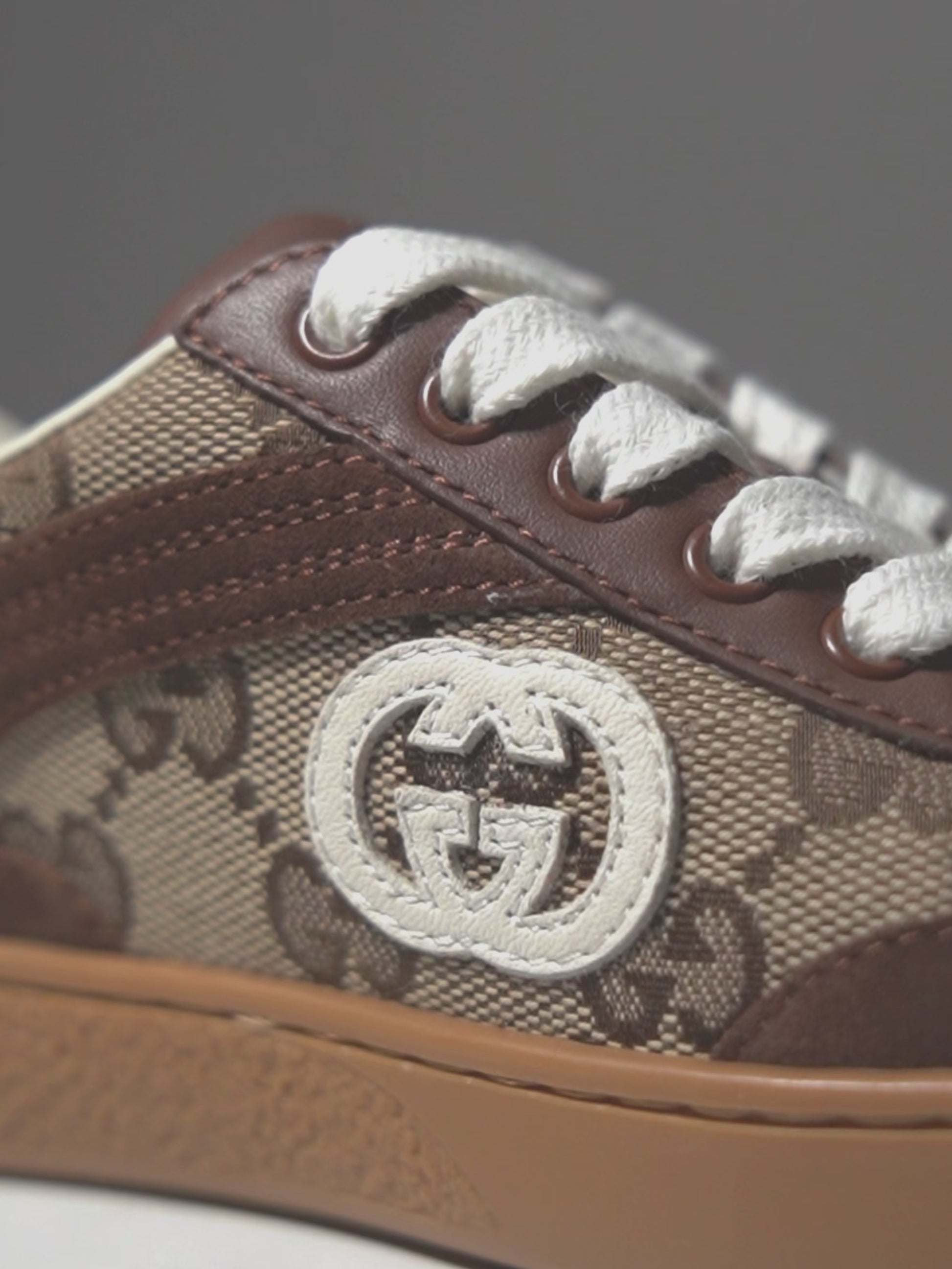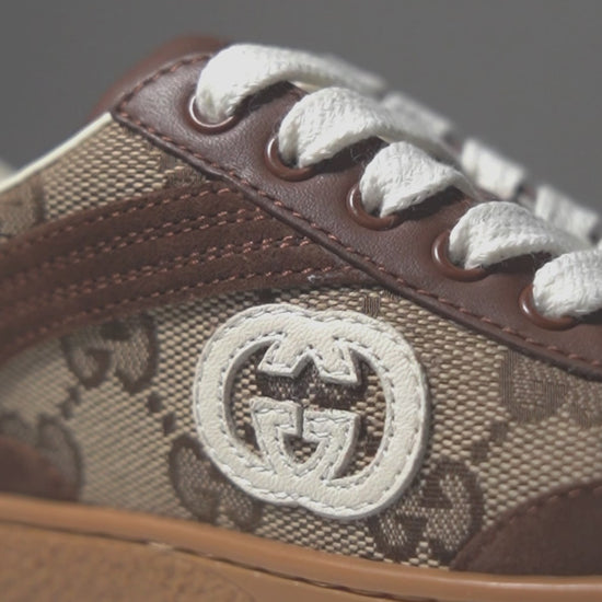 Colore: Marrone Descrizione: Sneakers G74 marroni del luxury brand Gucci Kids, realizzate in tela jacquard GG beige e marrone, con suola in gomma, lacci, dettagli in suede e punta tonda; dottae di doppi lacci. Sono decorate con logo G incrociato su un lato e sul retro. Made in Italy Dettagli: 50% Pelle, 50% Tessile.