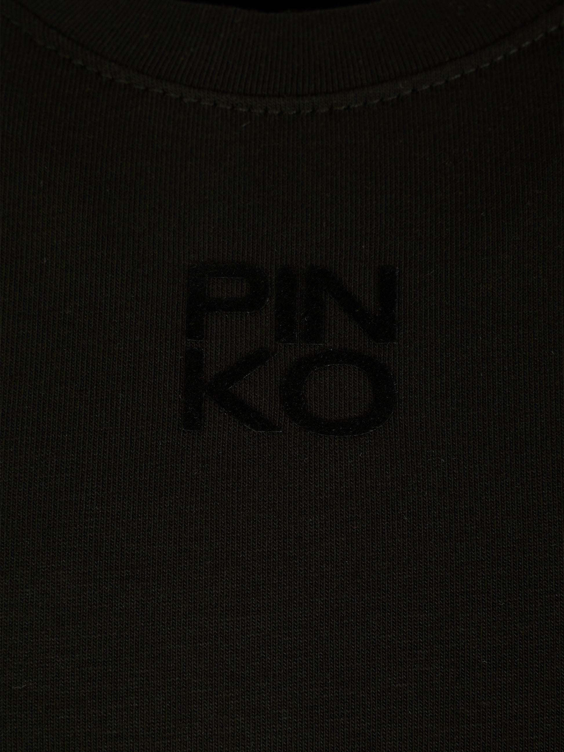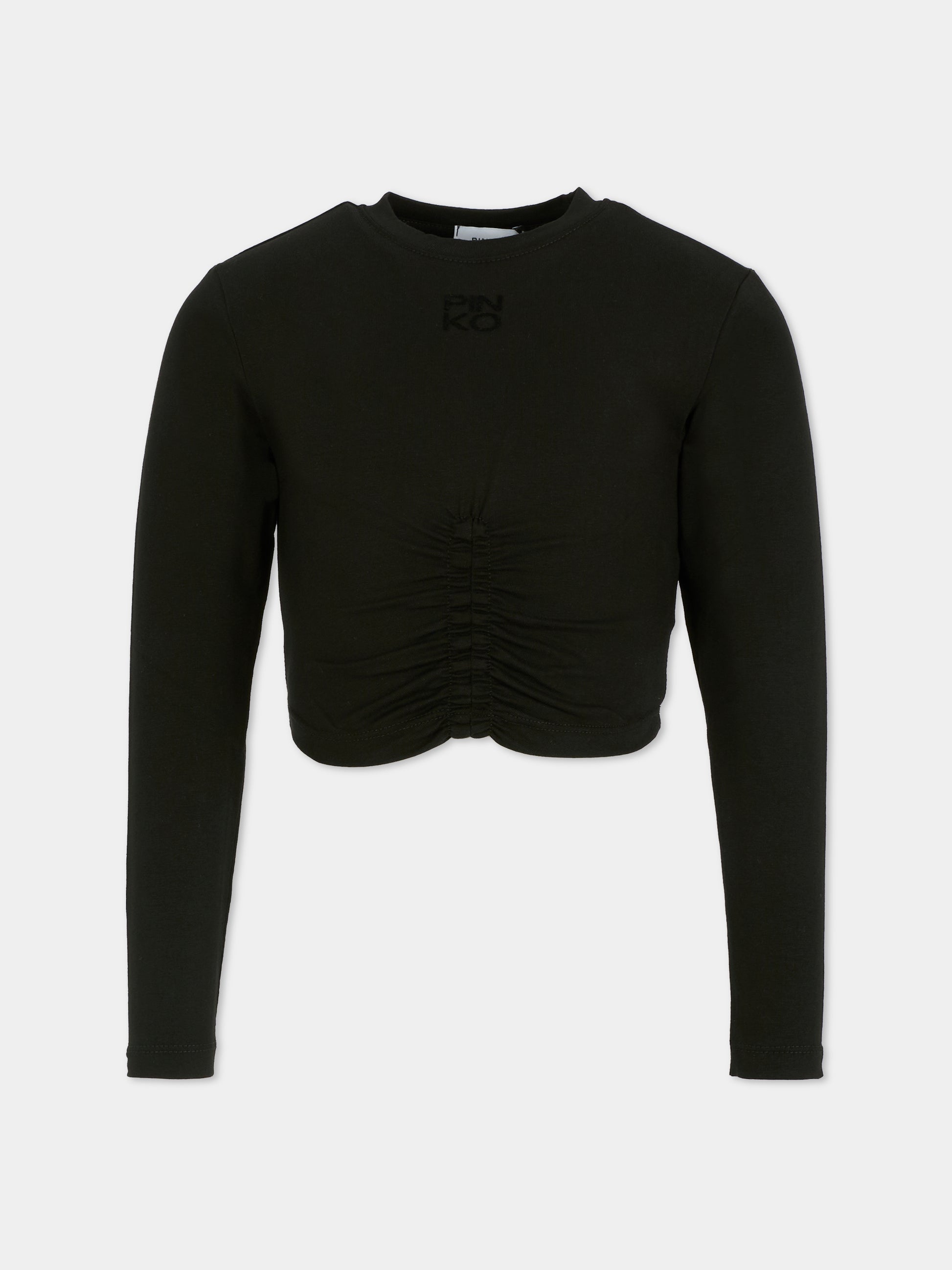 Colore: Nero Descrizione: T-shirt crop nera a maniche lunghe, con girocollo e dettaglio arricciato sulla parte anteriore. È decorata con logo in velluto sul davanti. Made in Italy Dettagli: 95% Cotone, 5% Elastan. Lavare a 30°C.