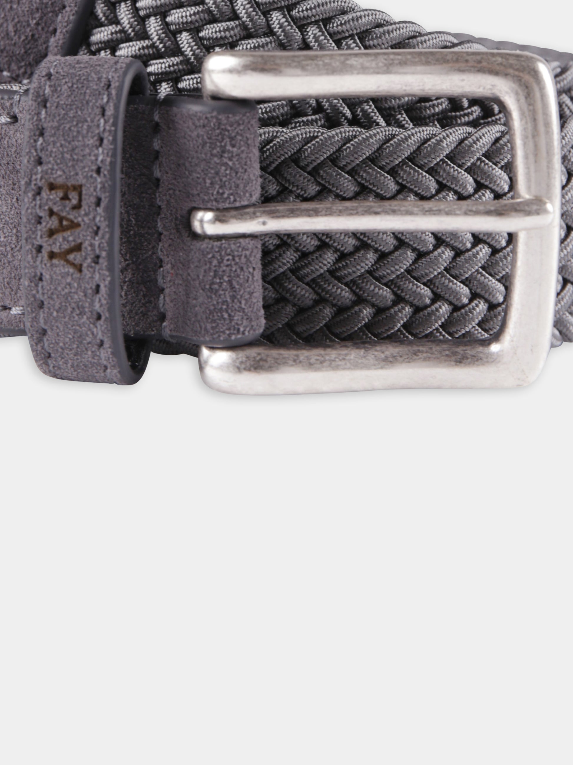 Colore: Grigio Descrizione: Cintura grigia in tessuto stretch intrecciato, chiusura con fibbia. È decorata con logo frontale. Made in Italy Dettagli: 60% Viscosa, 40% Elastan.