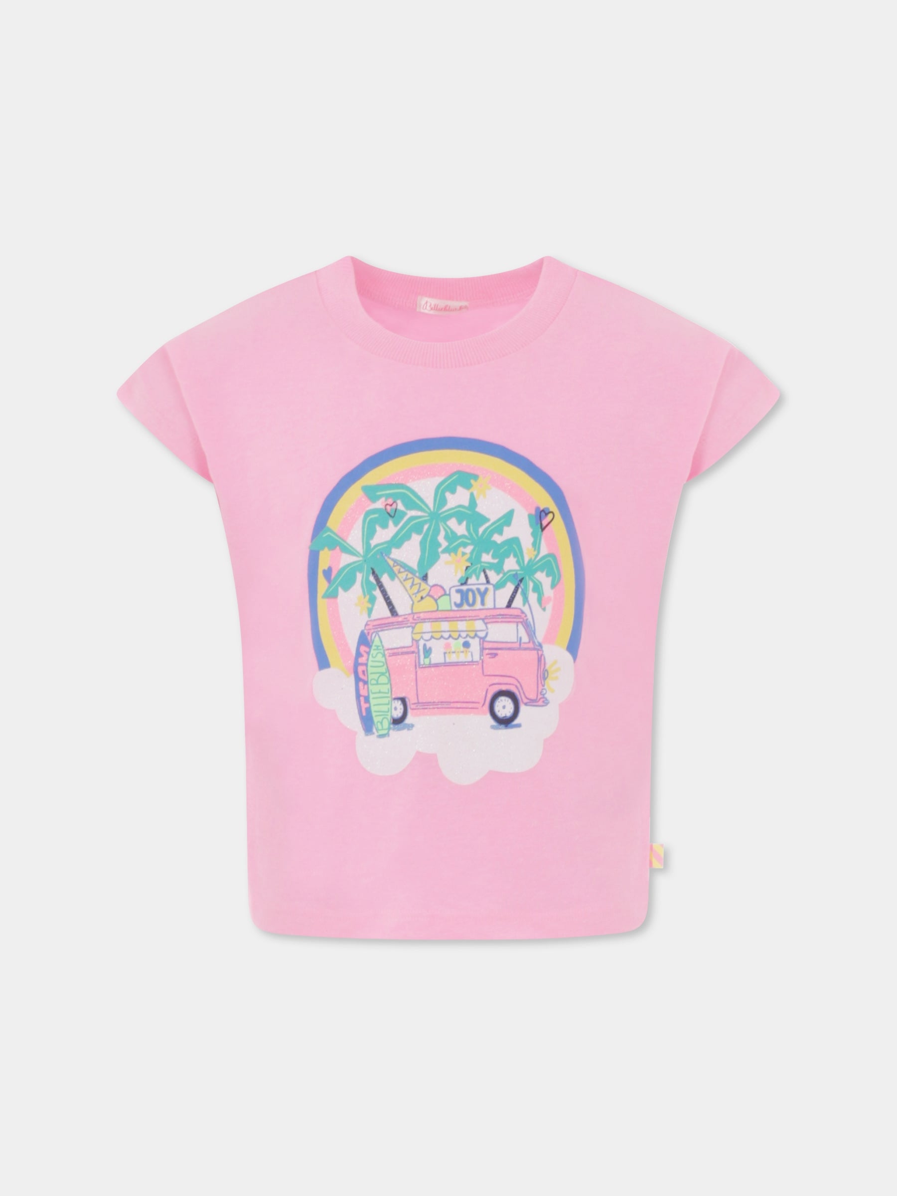 Colore: Rosa Descrizione: T-shirt rosa in misto cotone, con maniche corte e girocollo a costine. È decorata con stampa camioncino dei gelati e lurex sulla parte anteriore. Dettagli: 65% Poliestere, 35% Cotone. Lavare a 30°C.
