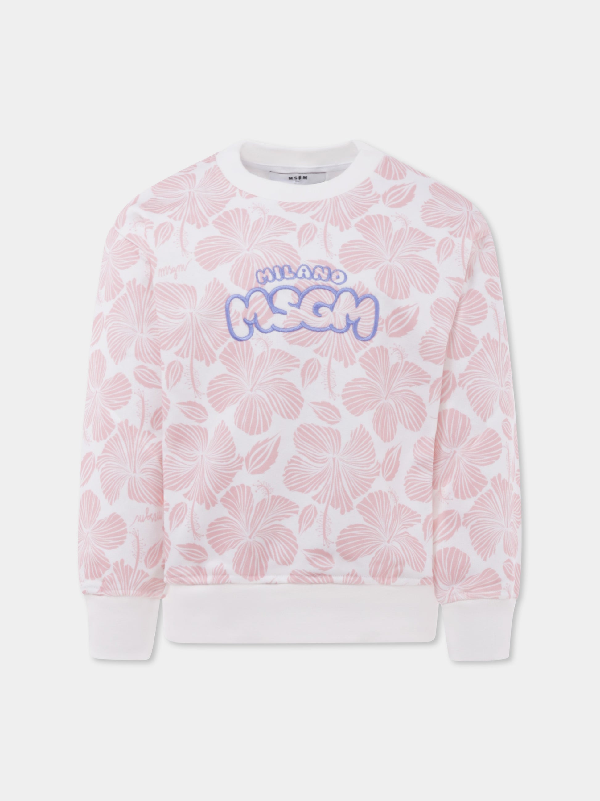 Colore: Rosa Descrizione: Felpa rosa in cotone garzato, a maniche lunghe, con girocollo, polsini e orlo a costine. È decorata con con stampa fiori all-over e logo ricamato sulla parte anteriore. Made in Italy Dettagli: 100% Cotone. Lavare a 30°C.