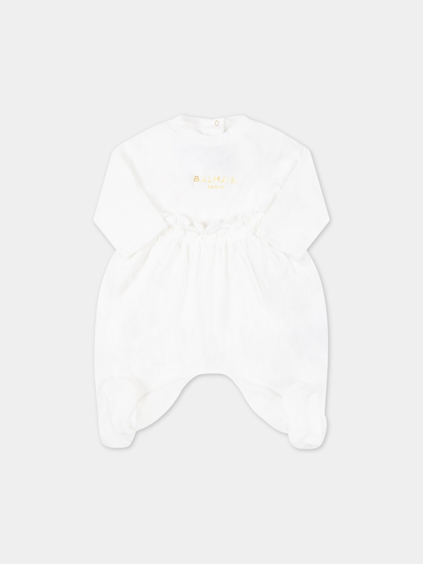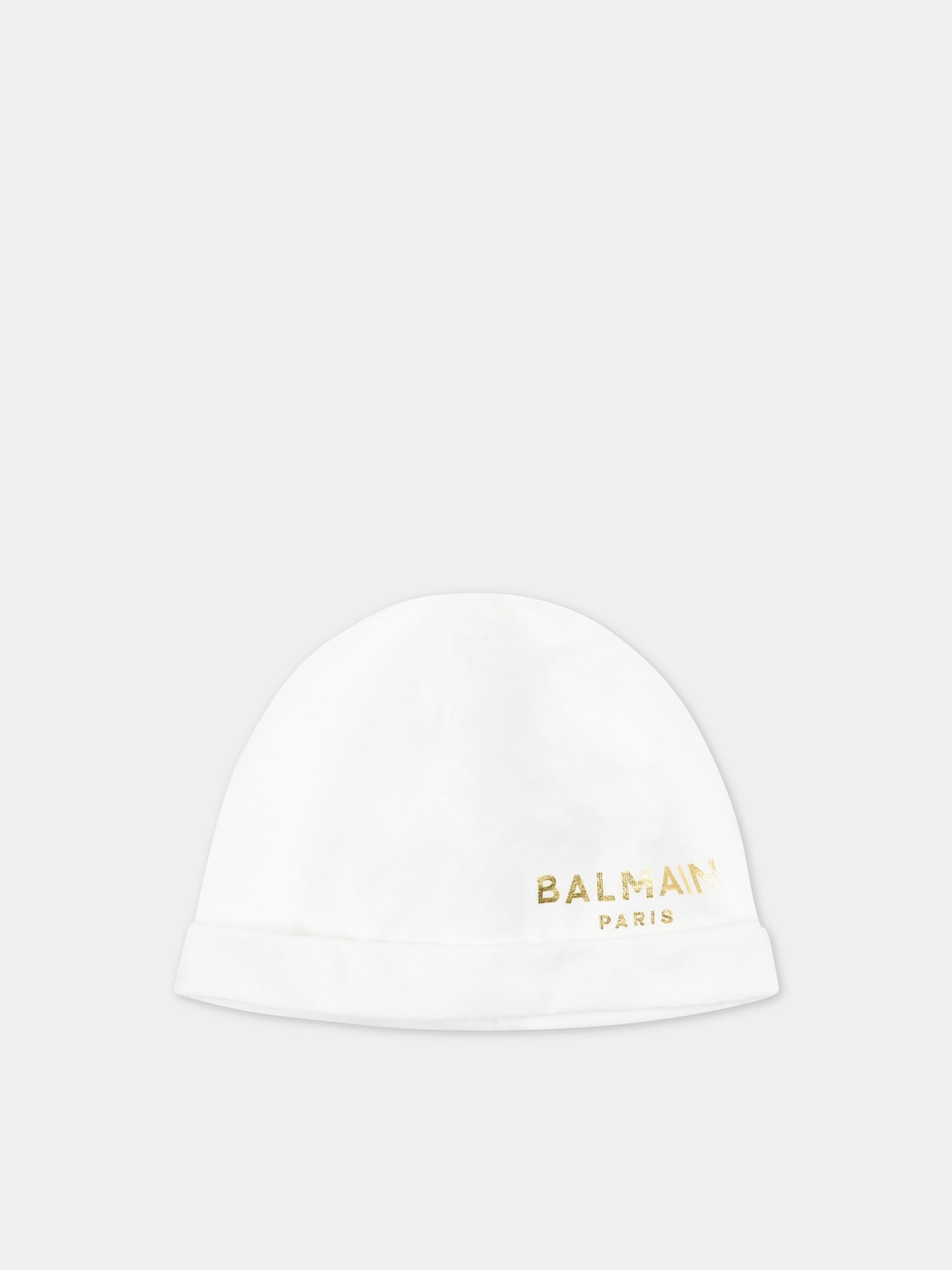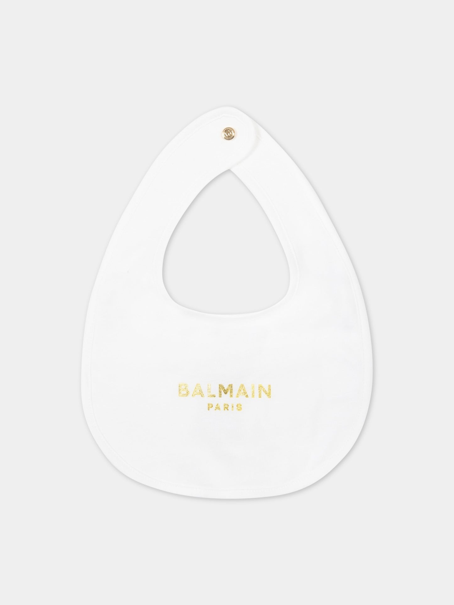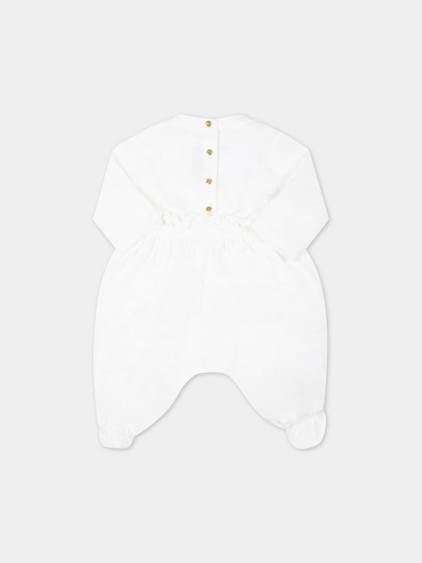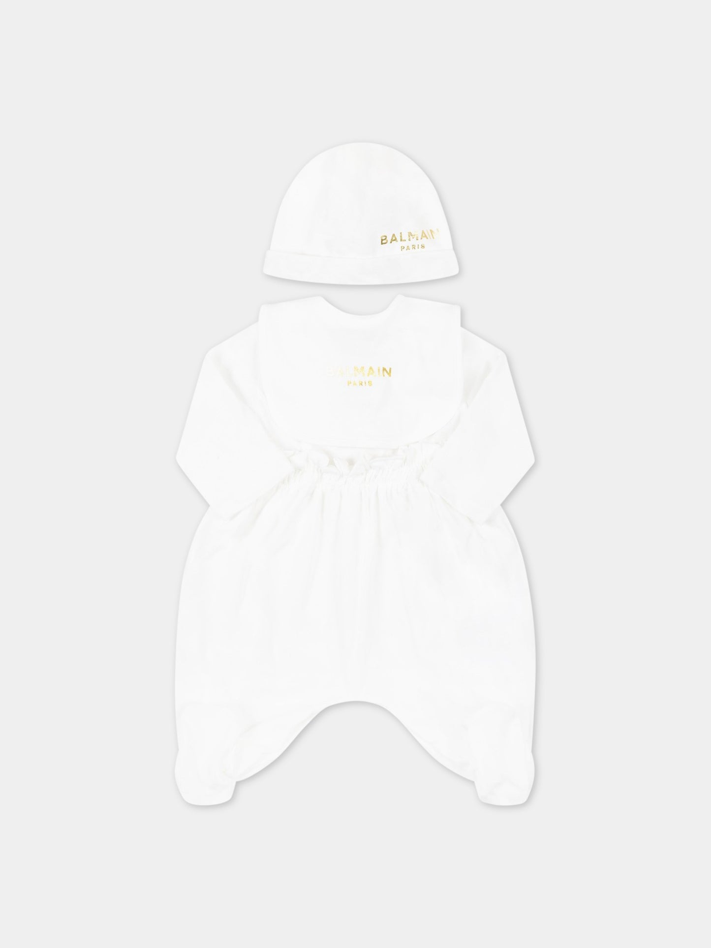 Colore: Bianco Descrizione: Set bianco composto da tutina bianca, cappello e bavaglino. Tutina bianca a maniche lunghe, con girocollo a costine, chiusura con clips sulla parte posteriore, piedini ed elastico in vita, è decorata con logo dorato sulla parte anteriore. Cappello bianco con risvolto, decorato con logo dorato sulla parte anteriore. Bavaglino bianco con chiusura con clip sulla parte posteriore e logo dorato sulla parte anteriore. Dettagli: 100%Cotone. Lavare a 30°C.