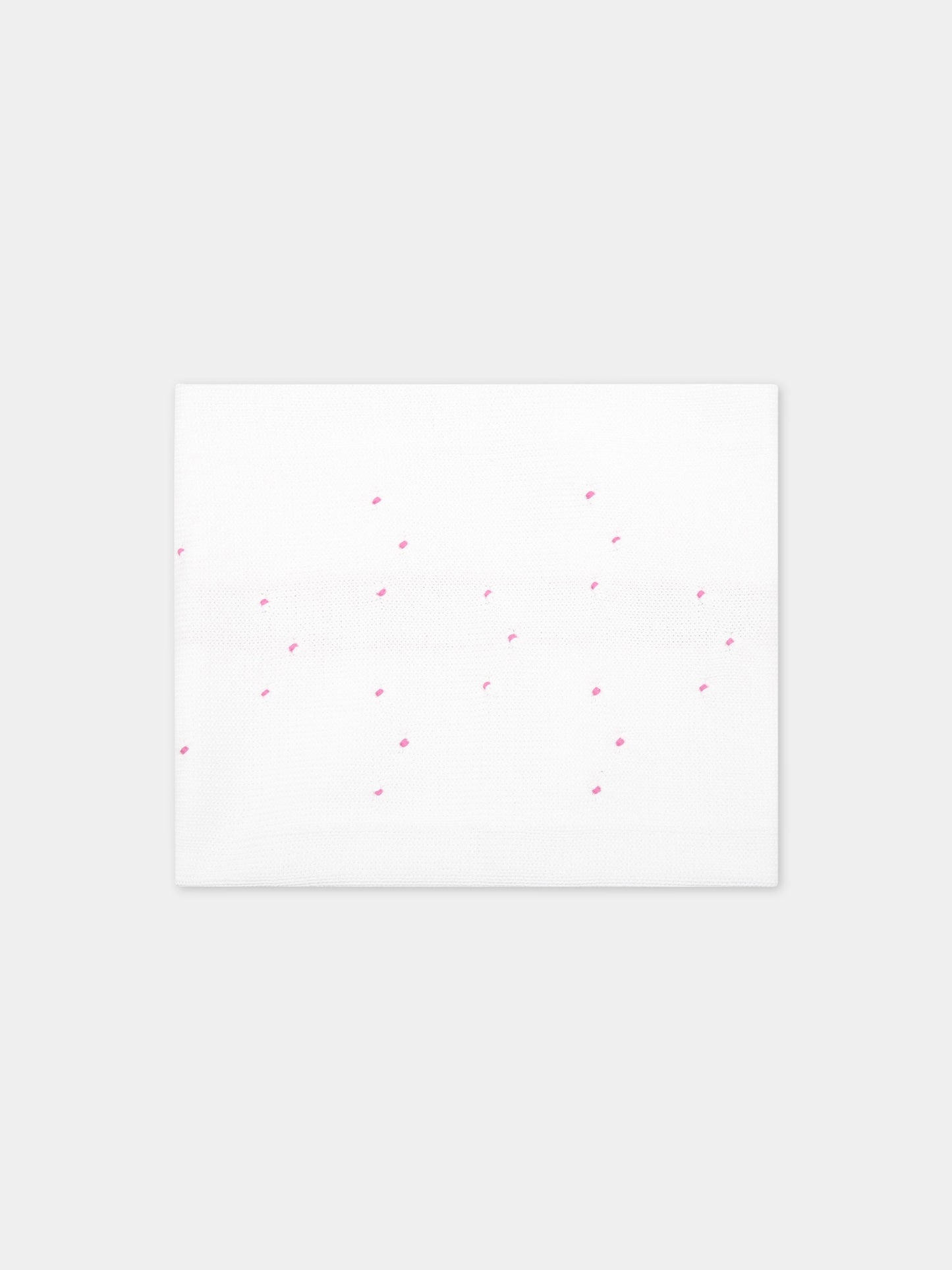 Colore: Bianco Descrizione: Coperta bianca, in cotone, decorata con dettagli e orlo viola. Si consiglia di effettuare un lavaggio a mano delicato e un'asciugatura su un piano disteso, non esponendo i capi ai raggi del sole. Dettagli: 79 x 71 cm. 100%Cotone. Lavare a mano.