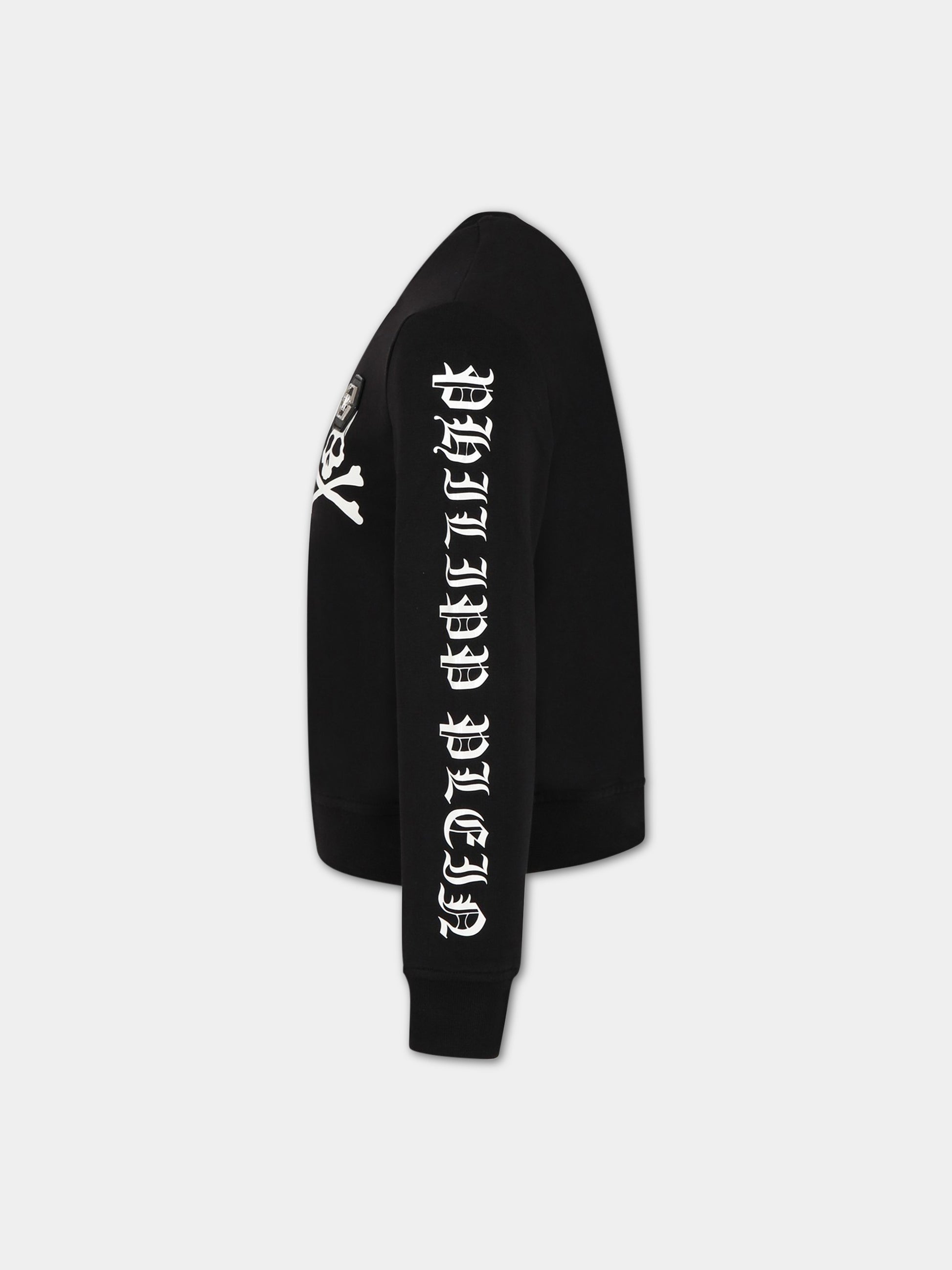 Colore: nero Descrizione: Felpa nera, in cotone garzato, con maniche lunghe, girocollo,polsini e orlo a costine. È decorata con stampa sulle maniche e sul petto, con patch logo sul petto. Dettagli: 95%cotone. 5%Elastan. Lavare a 30°C.