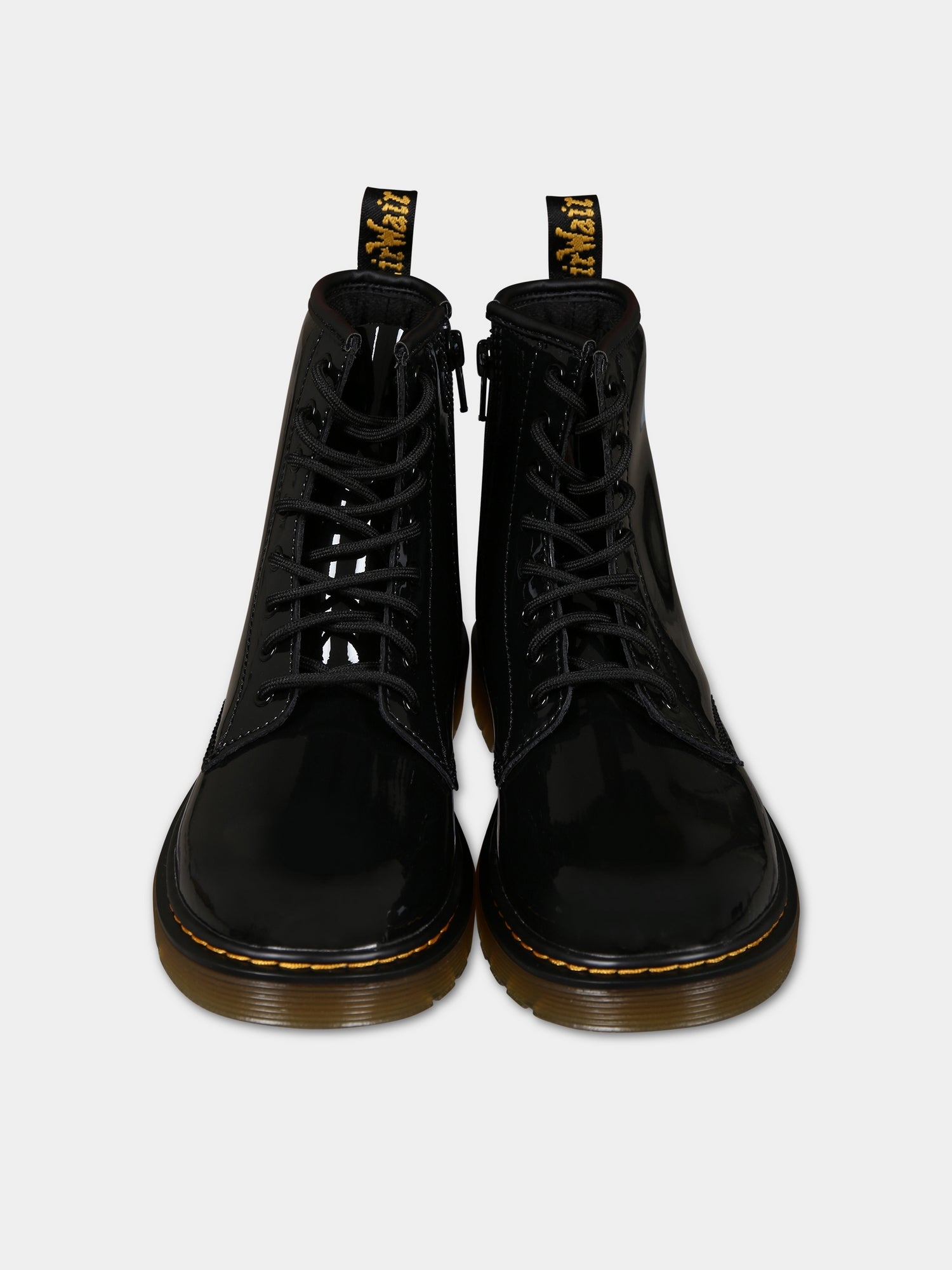 Colore: Nero Descrizione: Anfibi nero in pelle Patent Lamper con classico effetto vernice, lacci neri, suola flessibile, tomaia in pelle, rivestimento in tessuto e suola in PVC. Sono decorate con linguetta sul tallone gialla e nera, cuciture gialle iconiche. Dettagli: 100% Pelle Patent Lamper. Lavare con panno umido.