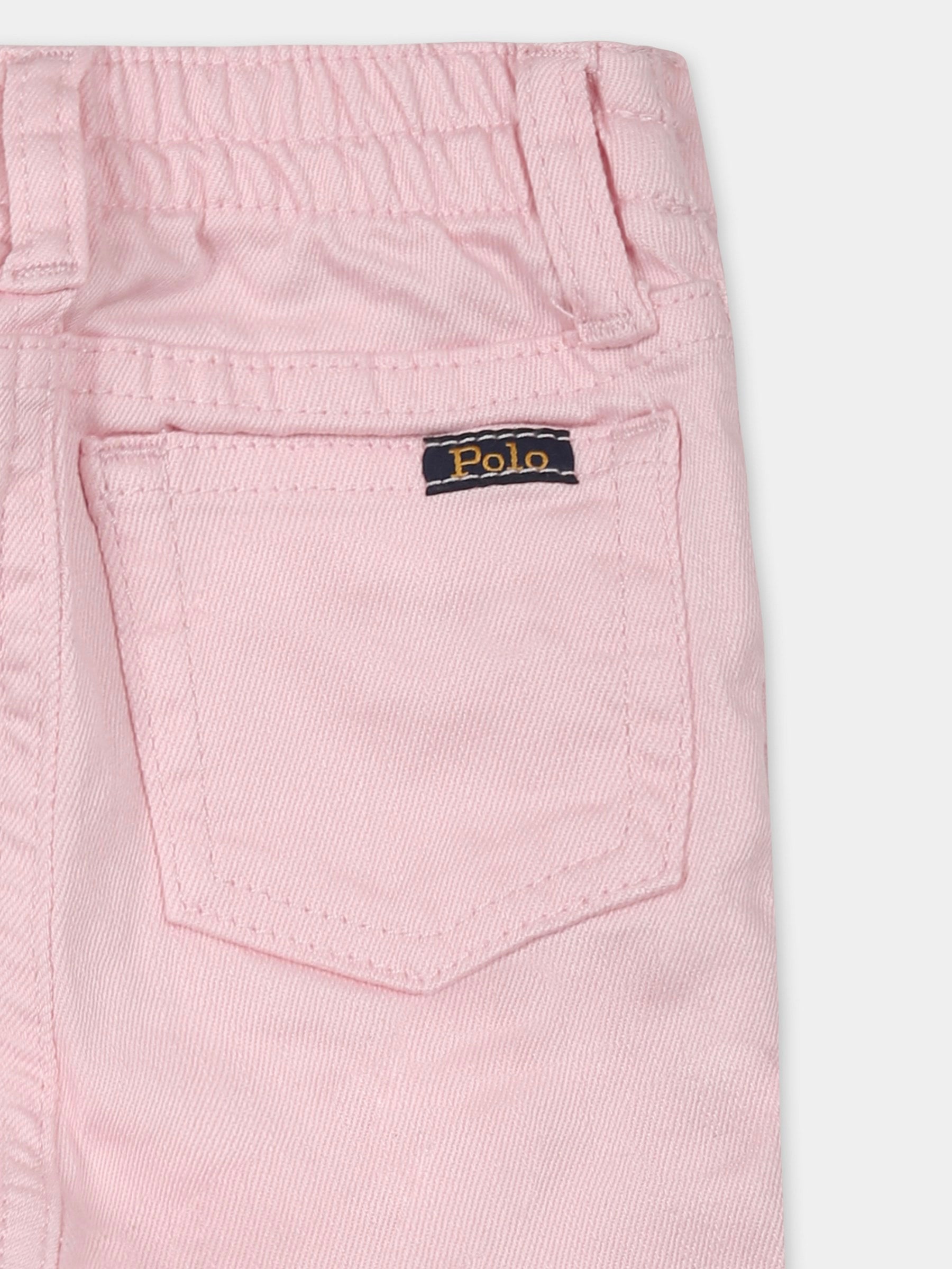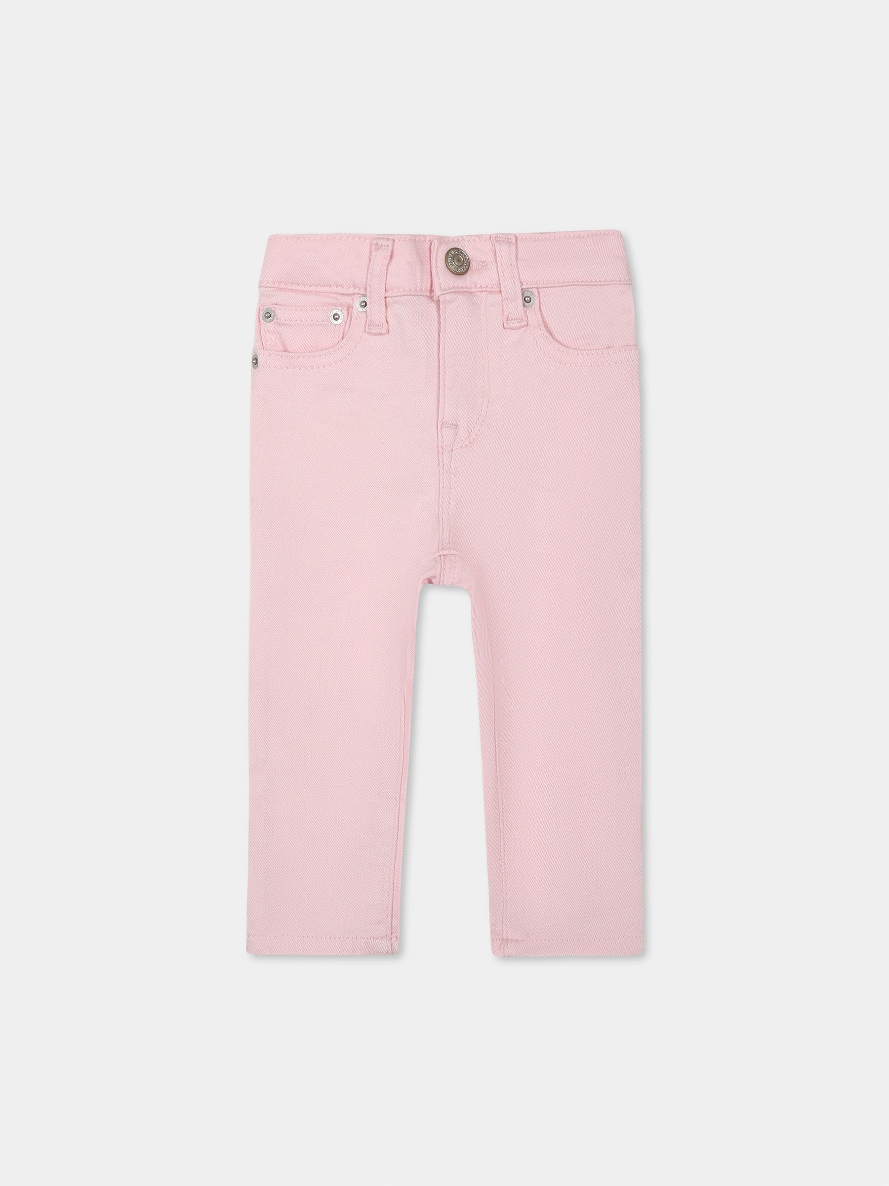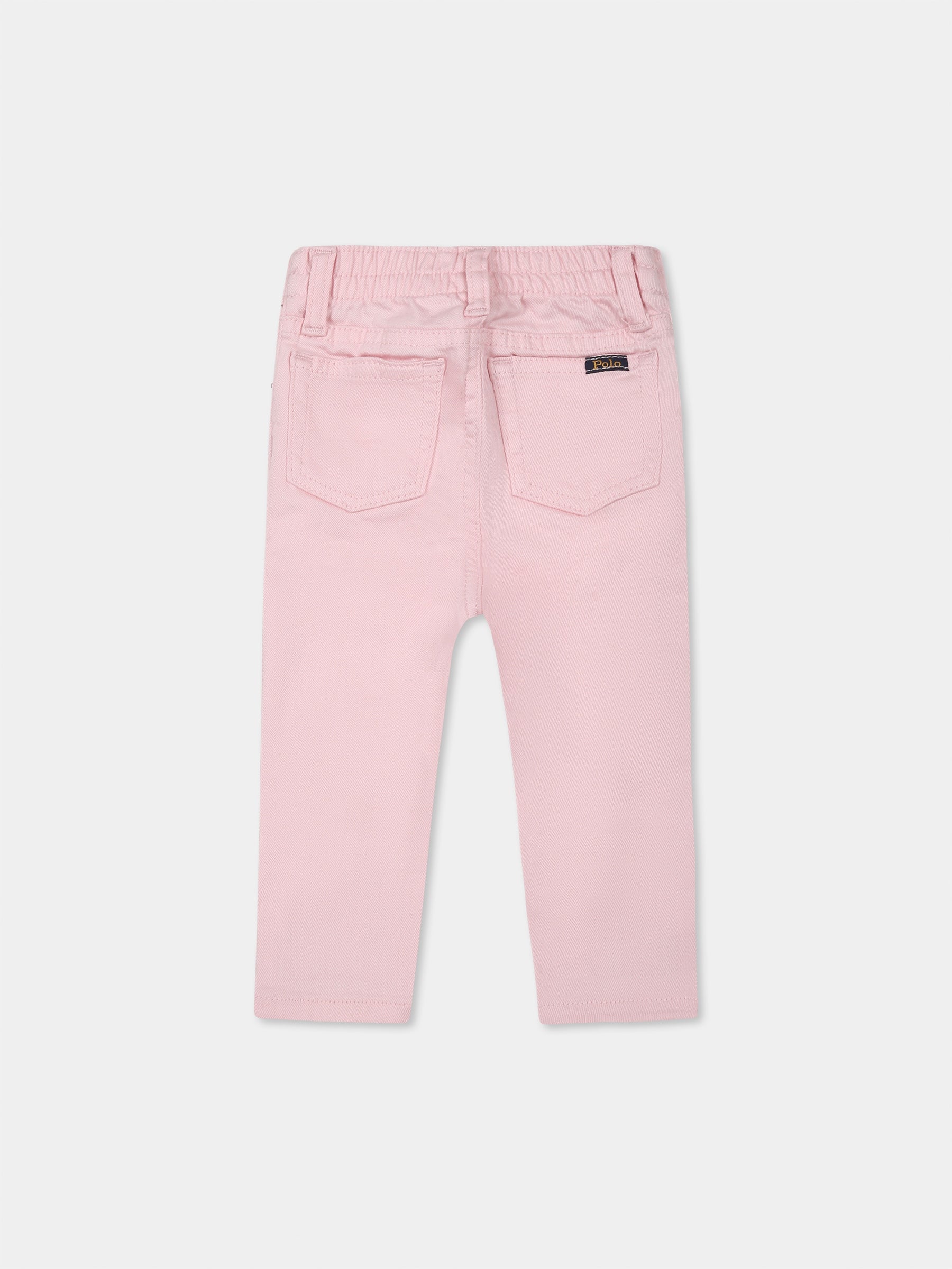 Colore: Rosa Descrizione: Jeans rosa denim cinque tasche, con passanti per cintura, chiusura frontale con zip e bottone automatico ed elastico sul retro. Sono decorati con patch logata sul retro. Dettagli: 92% Cotone, 4% Poliestere, 2% Elastan. Lavare a 30°C.