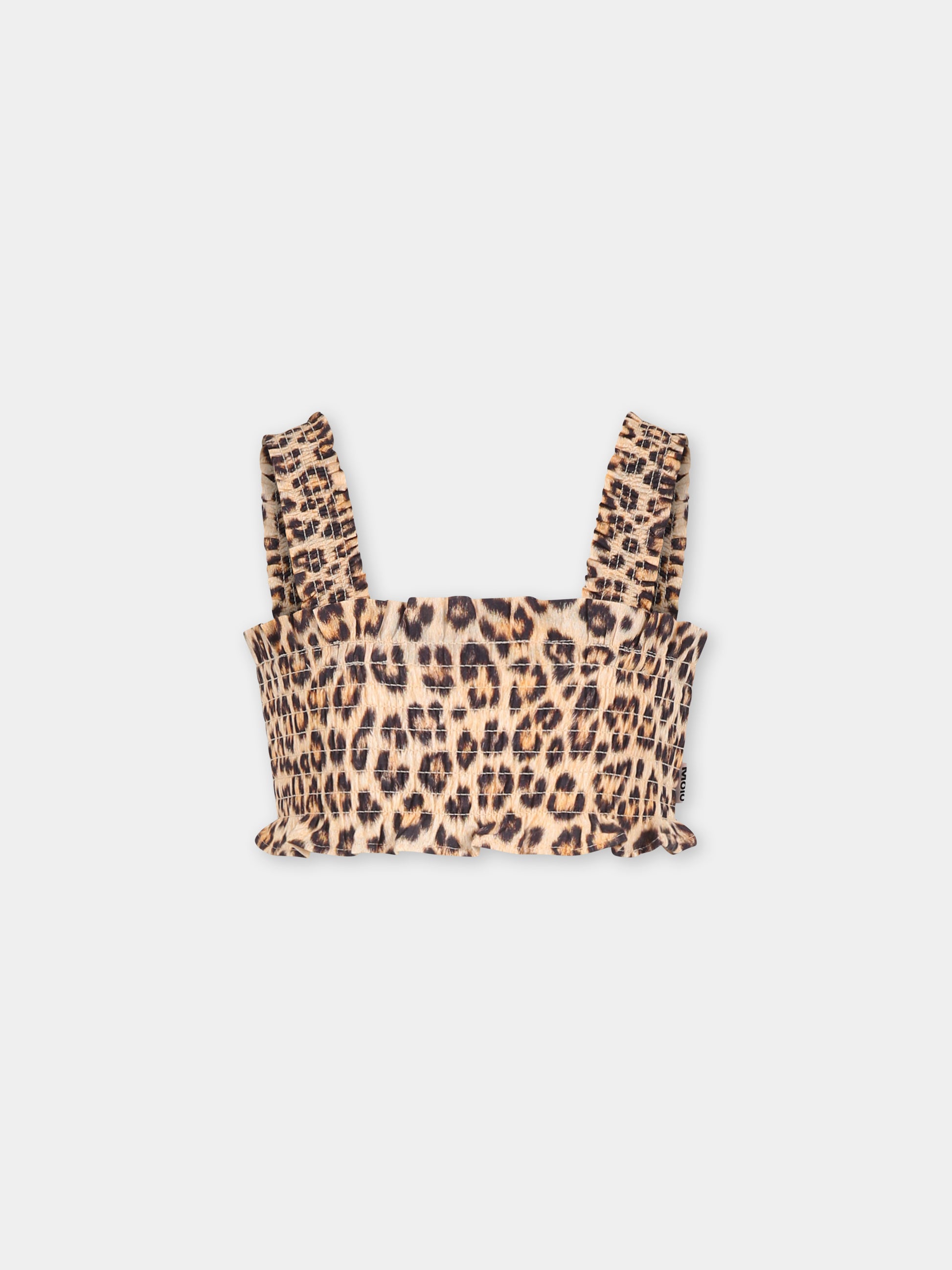 Colore: Marrone Descrizione: Top marrone elasticizzato in cotone organico certificato GOTS, con scollo arricciato e spalline elasticizzate. È decorato con stampa maculata all-over. Dettagli: 100% Cotone organico. Lavare a 30°C.