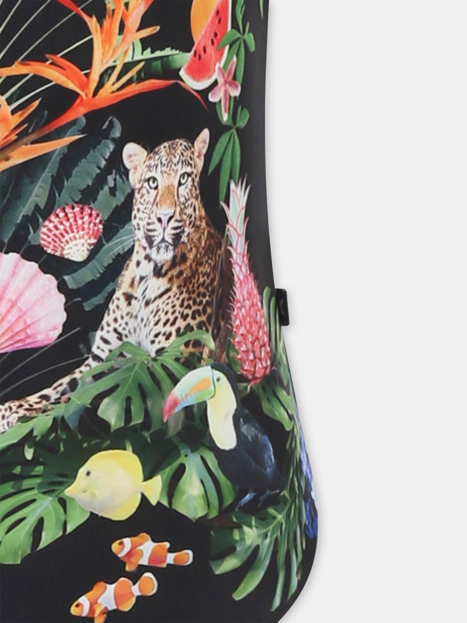 Colore: Nero Descrizione: Costume intero nero con spalline e scollo profondo sul retro; realizzato in parte con poliestere riciclato. È decorato con stampa leoaprdi e frutta sulla parte anteriore. Offre un'elevata protezione UV 50+. Dettagli: 78% Poliestere riciclato, 22% Elastan. Lavare a 30°C.