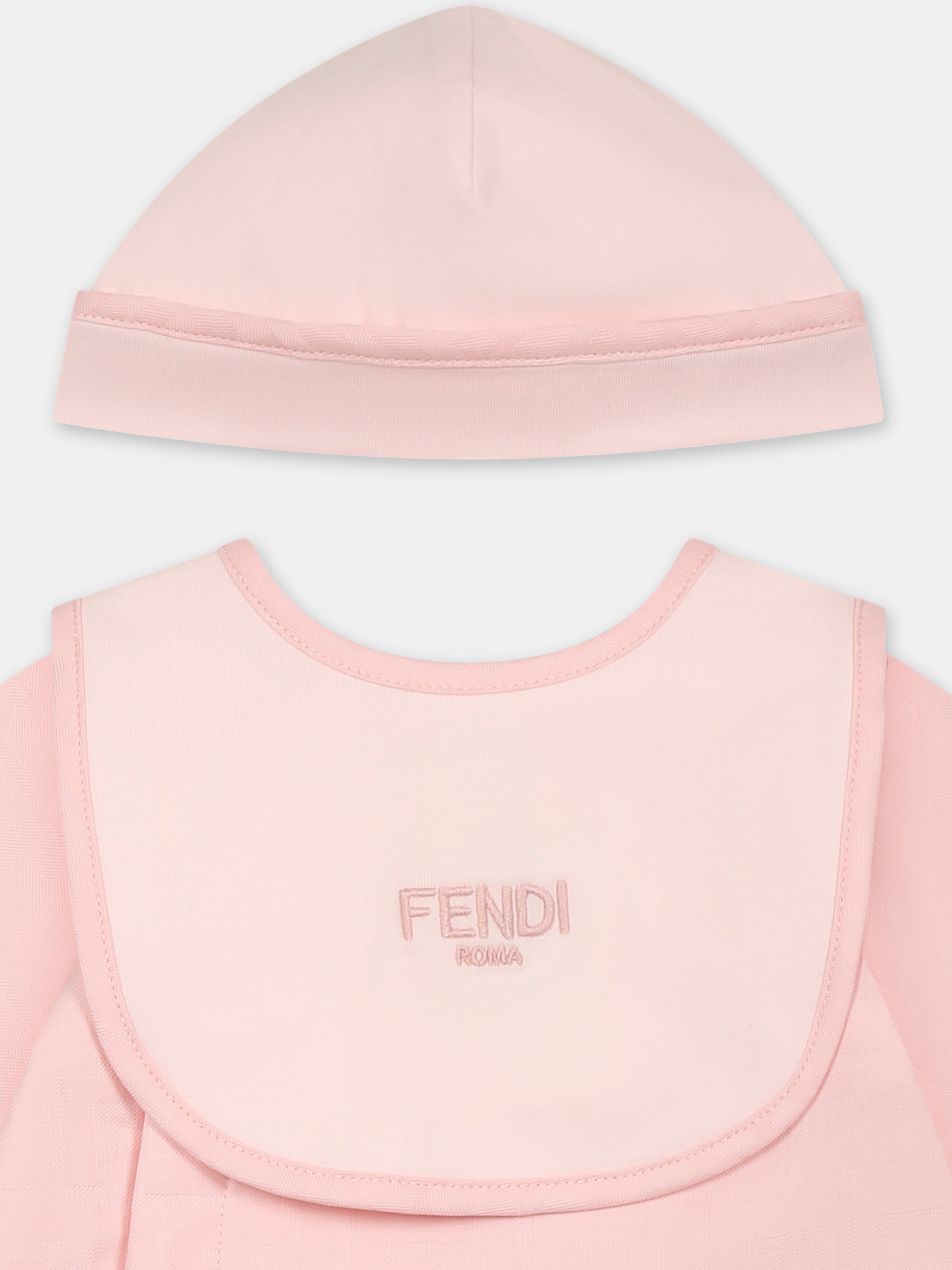 Colore: Rosa Descrizione: Set tutina rosa del luxury brand italiano Fendi Kids, realizzato in cotone, composto da tutina, bavaglino e cappello. Tutina a maniche lunghe, con parte superiore leggermente imbottita, scollo rotondo, chiusura fontale con bottoni automtaici sulla parte anteriore e piedini. È decorata con iconica FF all-over. Bavaglino con bottone automatico sul retro; é decorato con logo Fendi Roma ricamato sulla parte anteriore. Made in Italy Dettagli: 100% Cotone. Lavare a secco.