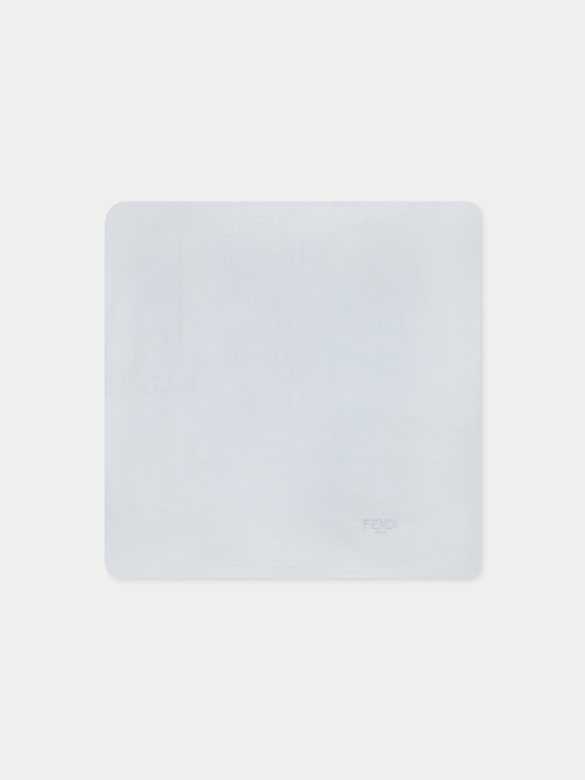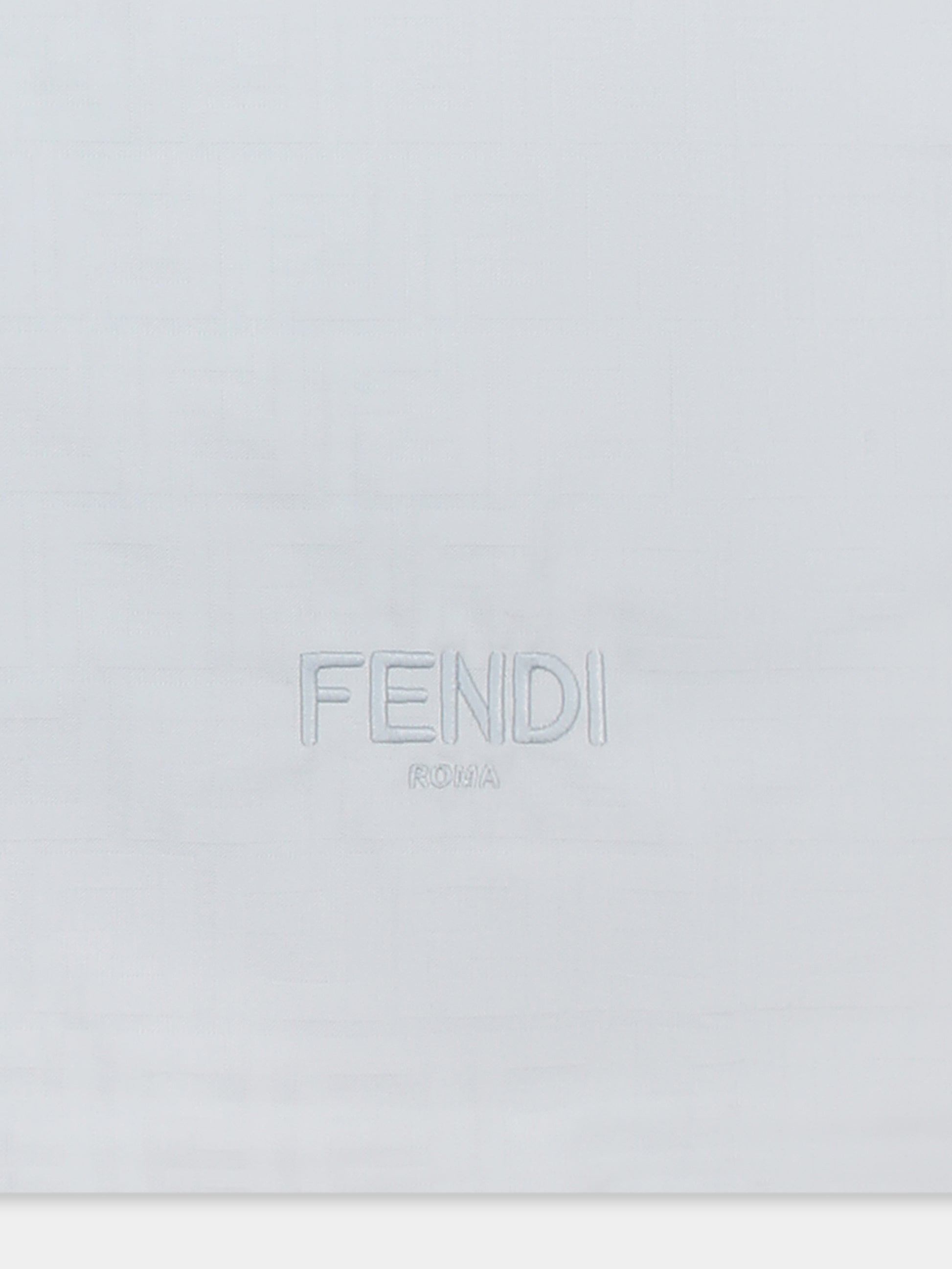 Colore: Celeste Descrizione: Coperta celeste del luxury brand italiano Fendi Kids, realizzata in cotone jacquard, leggermente imbottito. È decorata con iconica FF all-over e logo Fendi Roma ricamato sulla parte anteriore. Dimensioni (L x A): 79cm x78cm Made in Italy Dettagli: 100% Cotone. Lavare a secco.