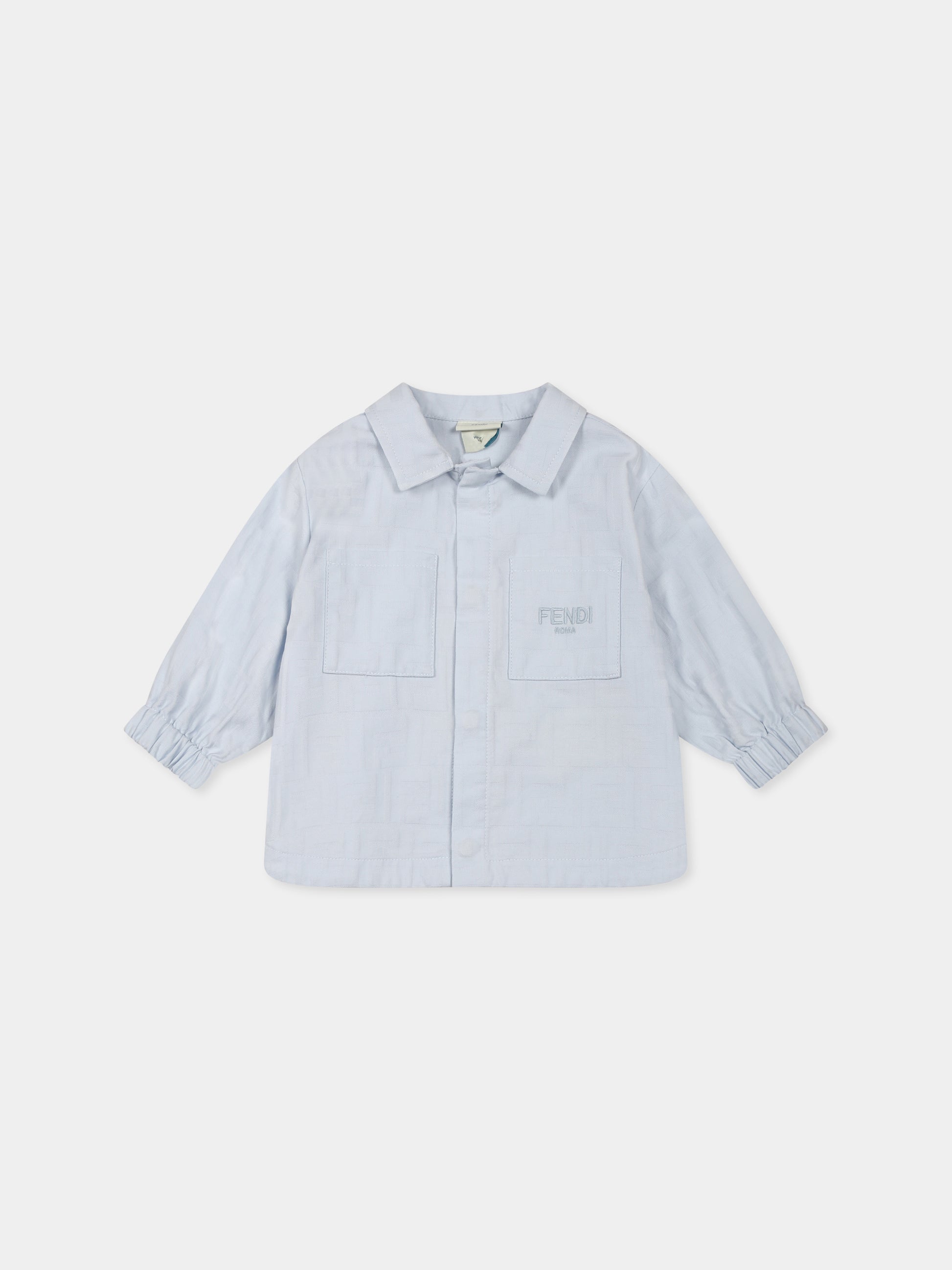 Colore: Celeste Descrizione: Giacca celeste del luxury brand italiano Fendi Kids, in jacquard di cotone. La giacca presenta maniche lunghe, un colletto classico, una chiusura frontale con bottoni automatici, pratiche tasche applicate sul petto e polsini elasticizzati per il massimo comfort. È decorata con iconica FF all-over e logo Fendi Roma ricamato sul petto. Made in Italy Dettagli: 100% Cotone. Lavare a secco.