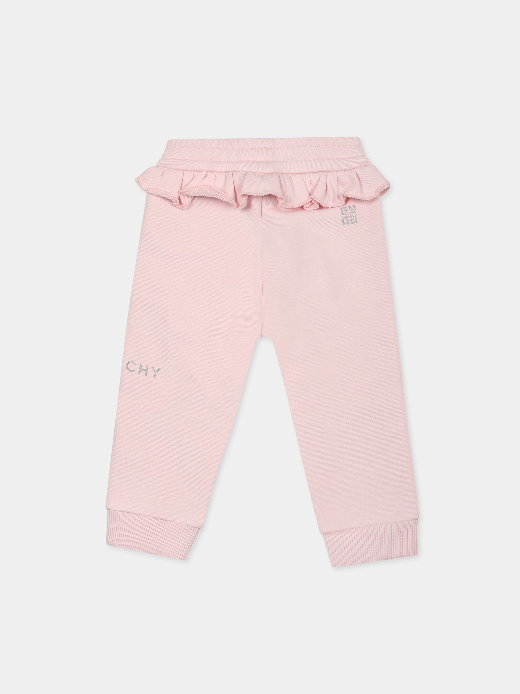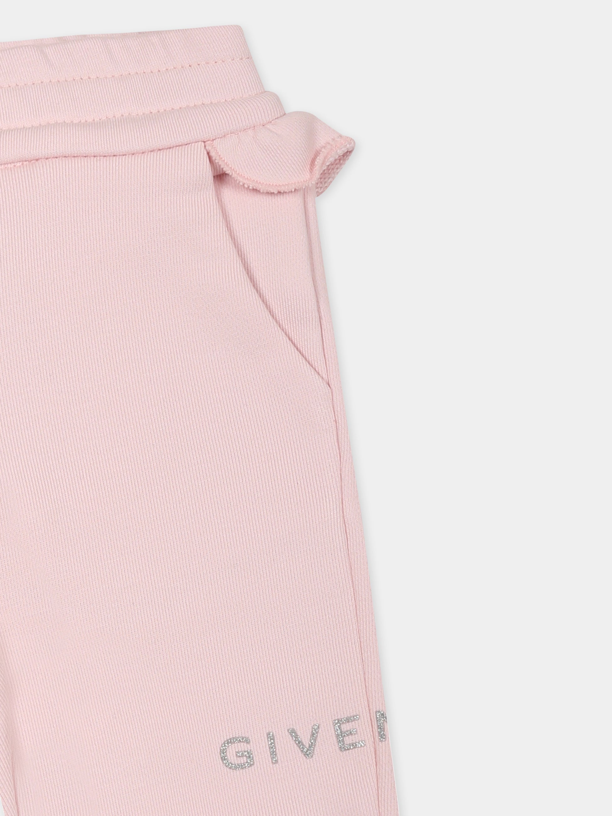 Colore: Rosa Descrizione: Pantaloni rosa del luxury brand francese Givenchy, realizzati in misto cotone garzato, con vita elasticizzata, tasche laterali, rouche sul retro e caviglie a costine. Sono decorati con logo in lurex sul lato e iconico motivo 4G sul retro. Dettagli: 85% Cotone, 15% Poliestere. Lavare a 30°C.
