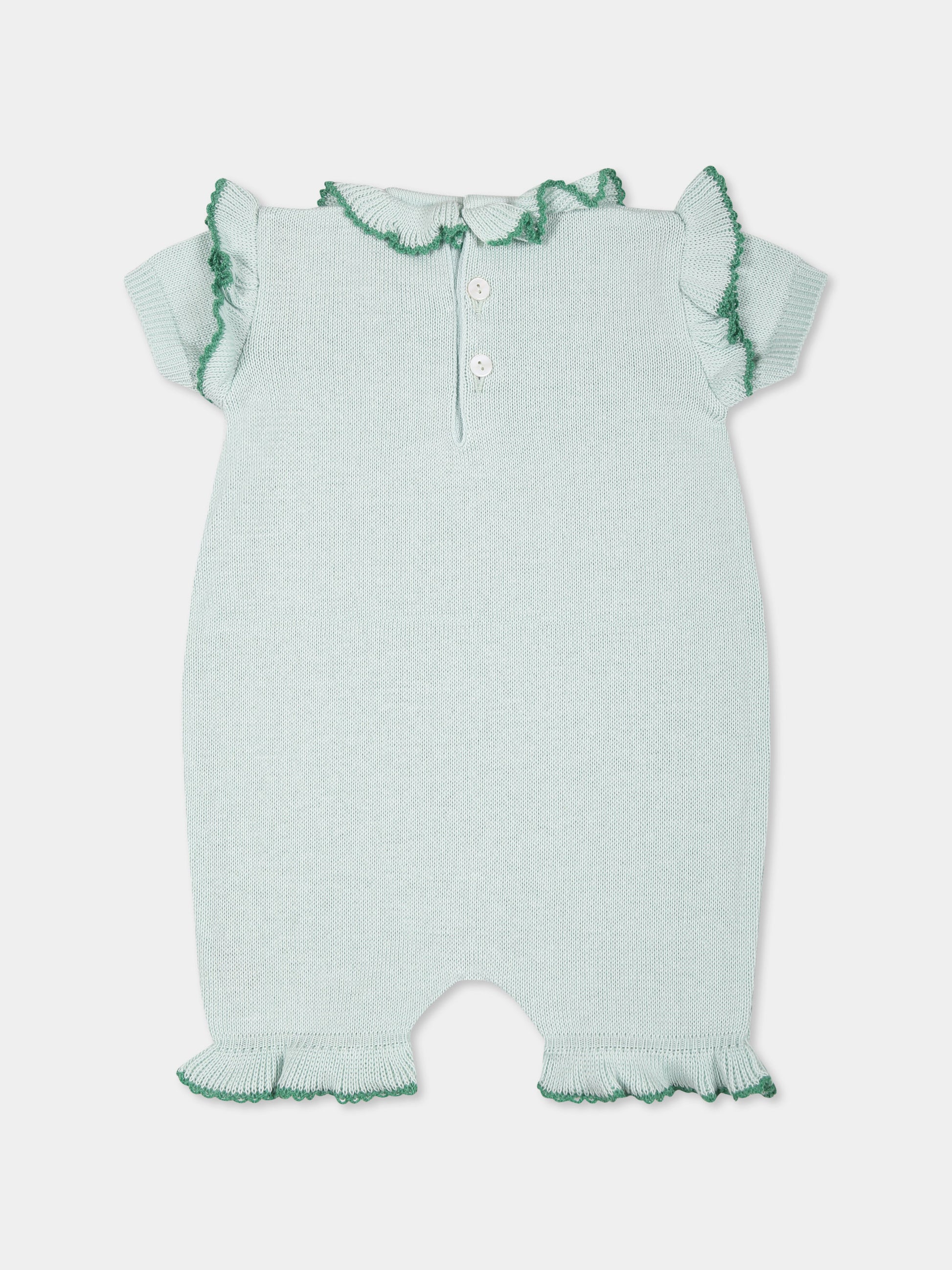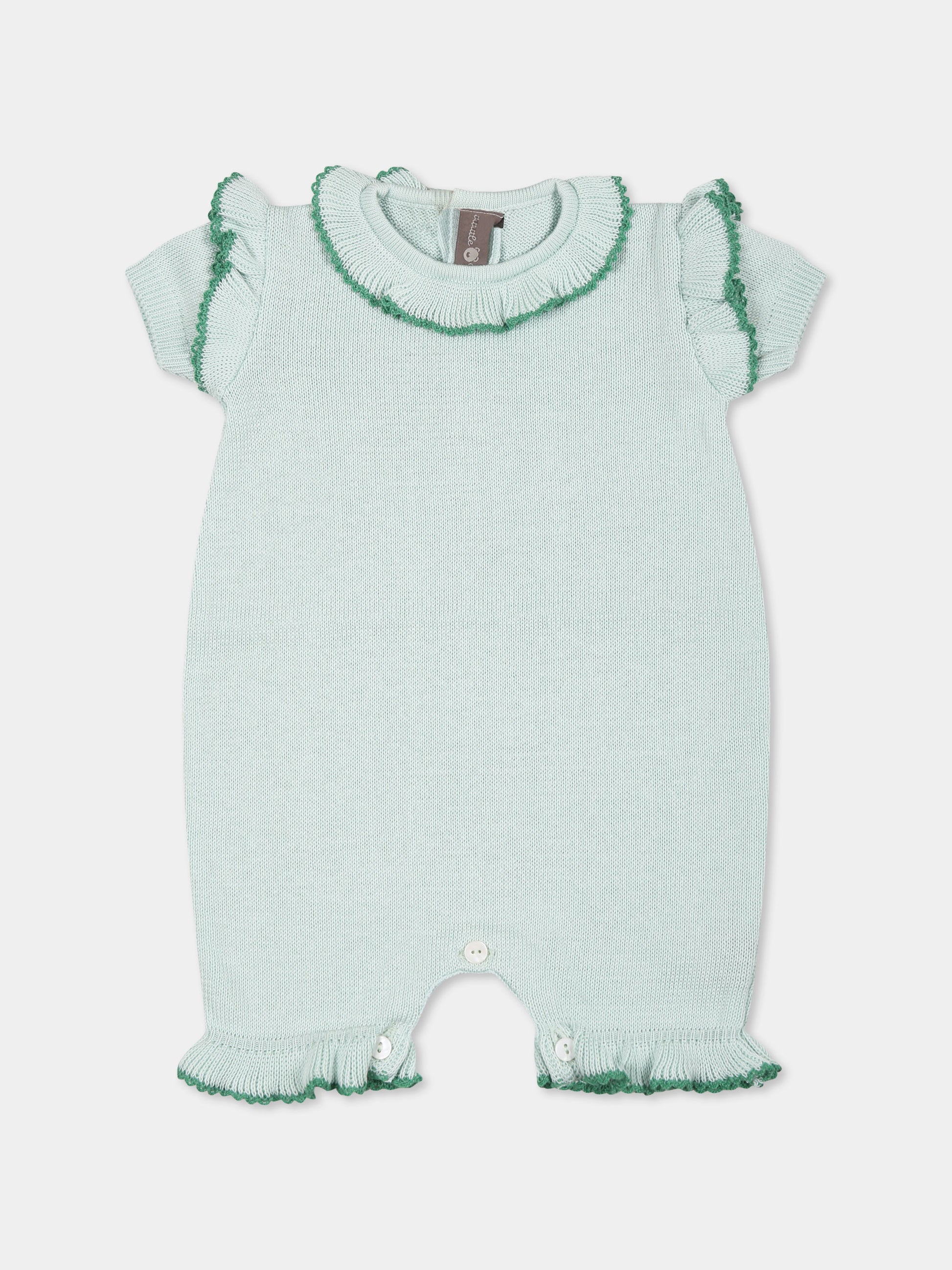 Colore: Verde Descrizione: Pagliaccetto verde in filo di cotone, a maniche corte, con girocollo, rouche intorno al collo, sulle spalle e sul fondo, chiusura con bottoni in madreperla sul retro e tra le gambe. Made in Italy Dettagli: 100% Cotone. Lavare a mano.