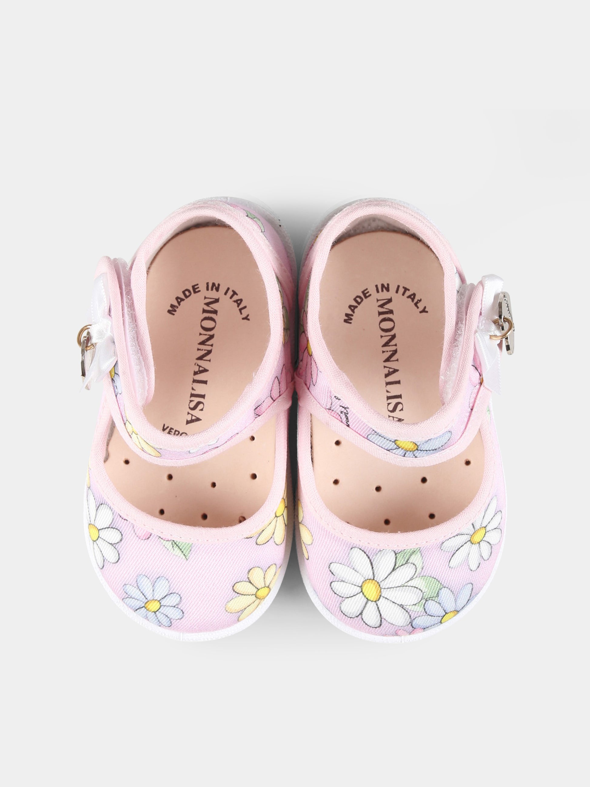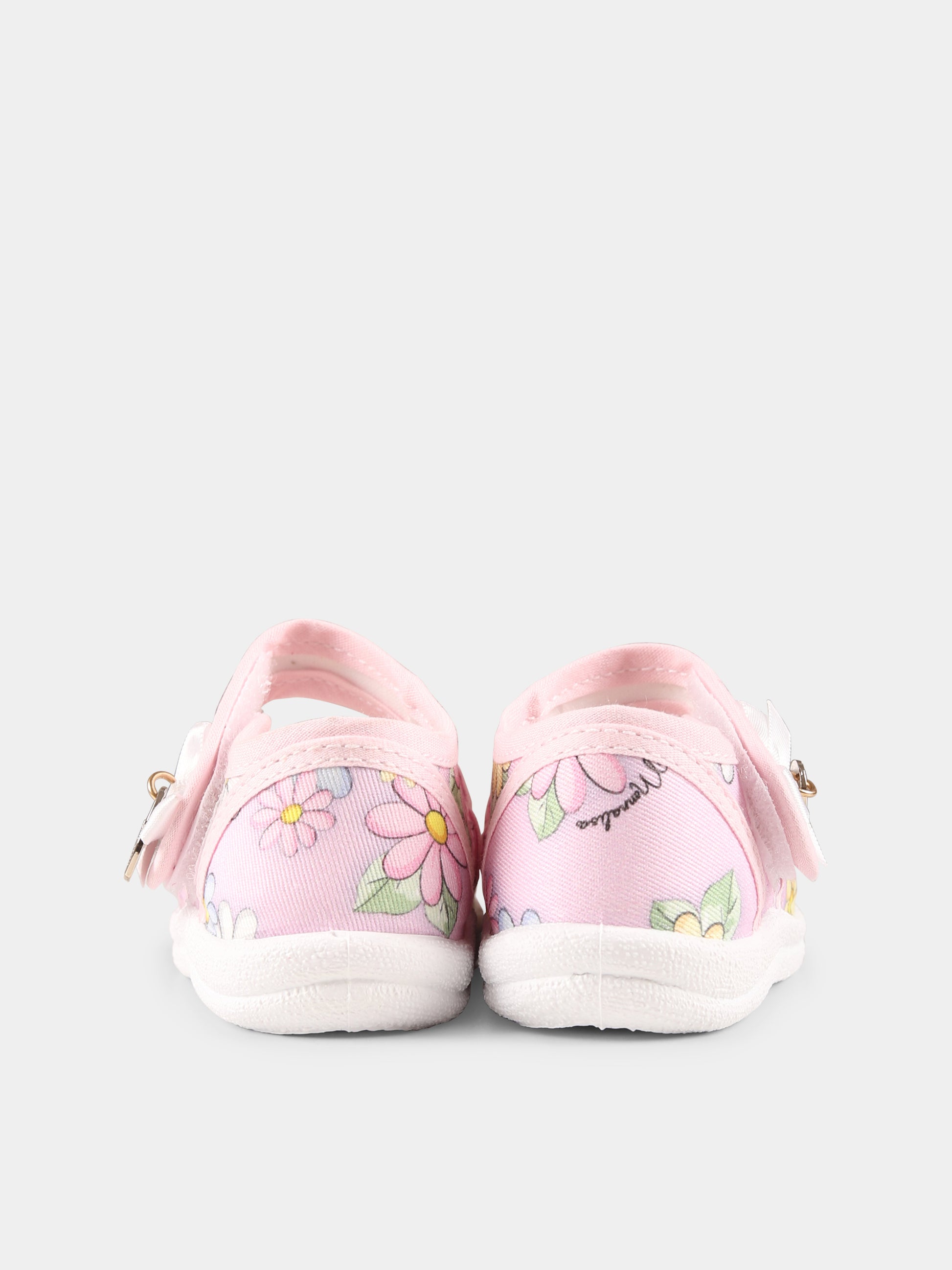 Colore: Rosa Descrizione: Ballerine rosa in tessuto, con suola in gomma, cinturino alla caviglia, chiusura a strappo e punta tonda. Sono decorate con margherite all-over e con fiocco e cuore logato su un lato. Made in Italy Dettagli: 100% Cotone.
