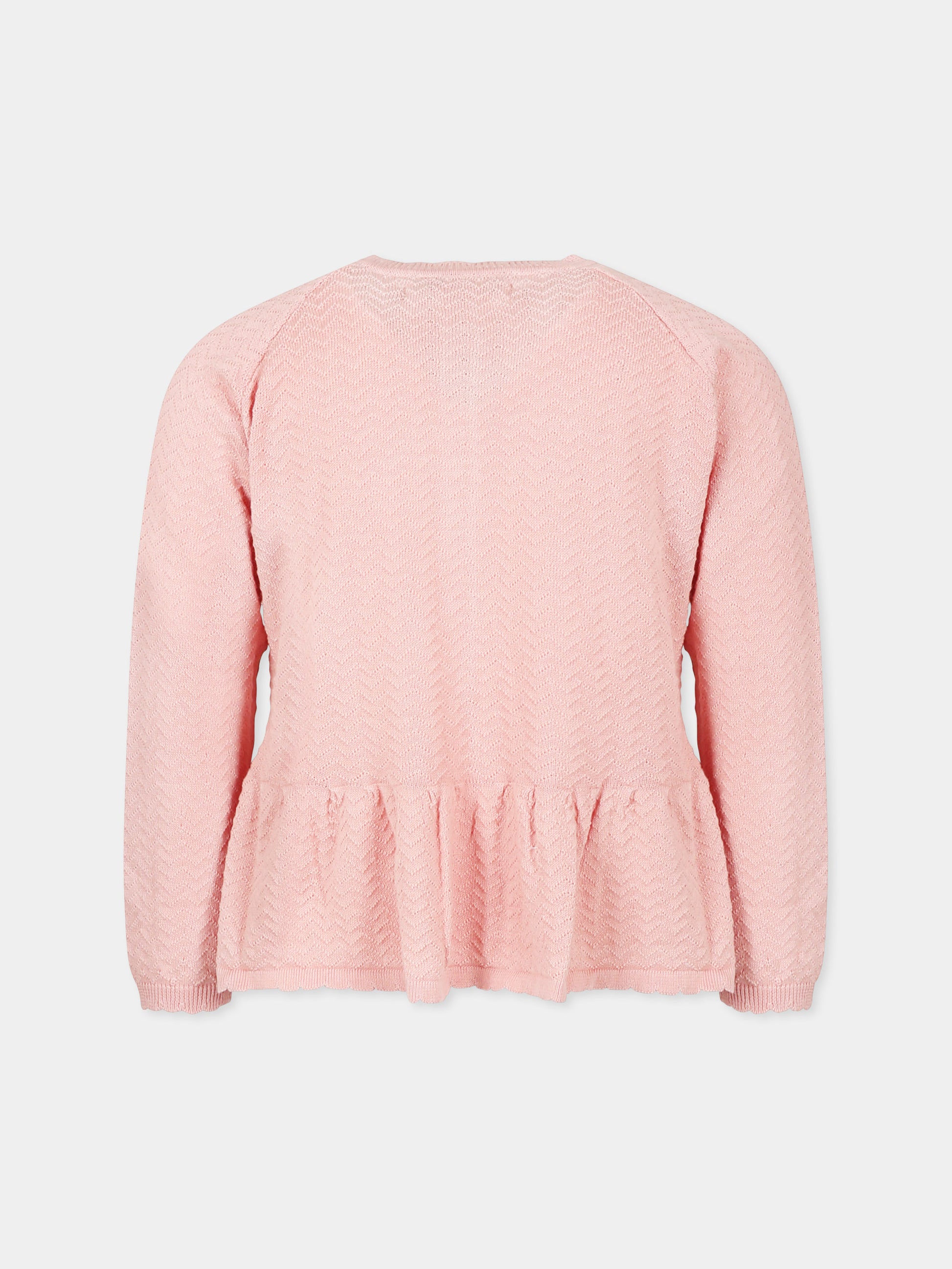 Colore: Rosa Descrizione: Cardigan rosa in cotone organico, a maniche lunghe, con girocollo a costine, chiusura frontale con bottoni, volant sul fondo, polsini e orlo a costine. È decorato con ciliegie ricamate sulla parte anteriore. Dettagli: 100% Cotone organico. Lavare a 30°C.