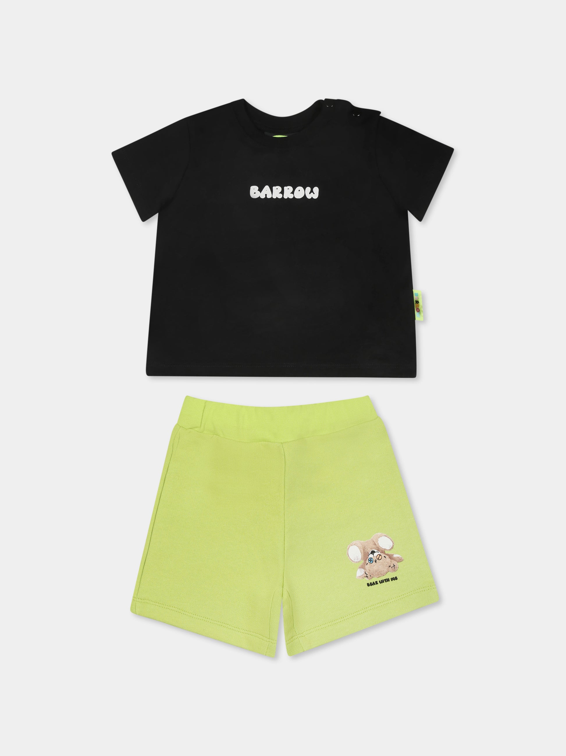 Colore: Multicolor Descrizione: Completo multicolor in cotone composto da t-shirt e shorts. T-shirt nera a maniche corte, con girocollo a costine e chiusura con bottoni automatici sulla spalla. È decorata con logo frontale e con stampa Bear sul retro. Shorts verdi in cotone garzato, con vita elasticizzata. Sono decorati con stampa Bear sulla gamba. È dotato di portachiavi giallo logato. Dettagli: 100% Cotone. Lavare a mano.