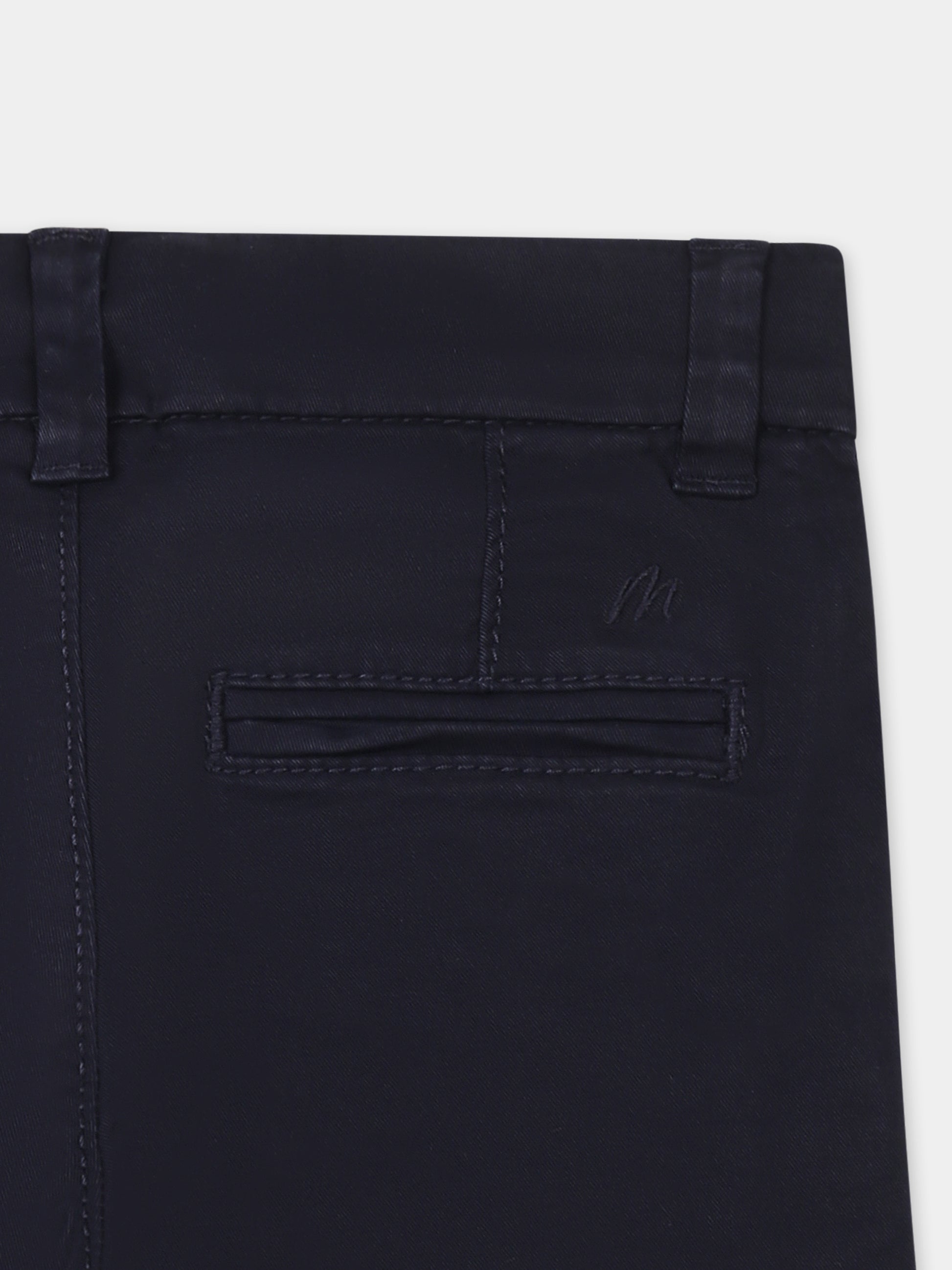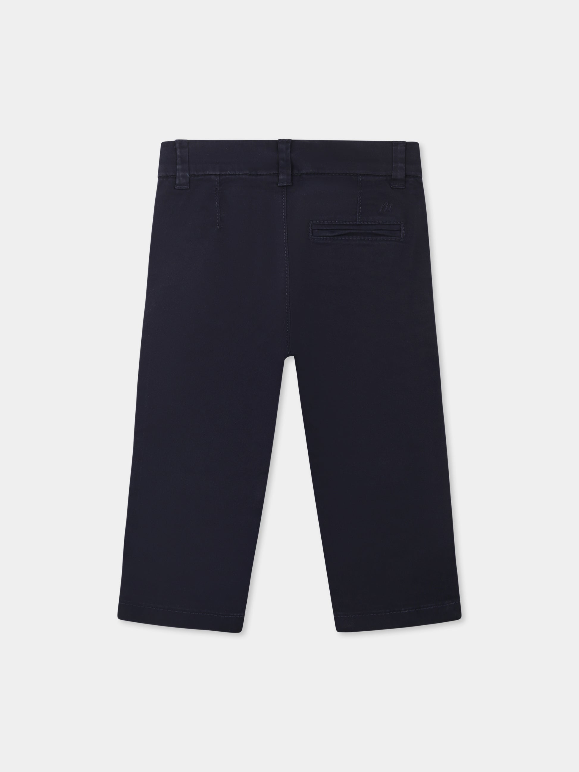 Colore: Blu Descrizione: Pantaloni blu in misto cotone, con chiusura con bottone e zip, vita regolabile grazie ad elastico interno con bottoni, passanti per cintura, tasche a filo laterali e tasche posteriori. Dettagli: 98% Cotone, 2% Elastan. Lavare a 30°C.